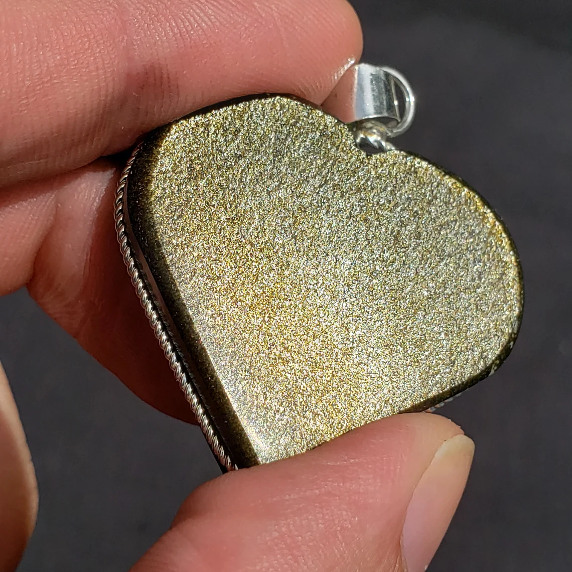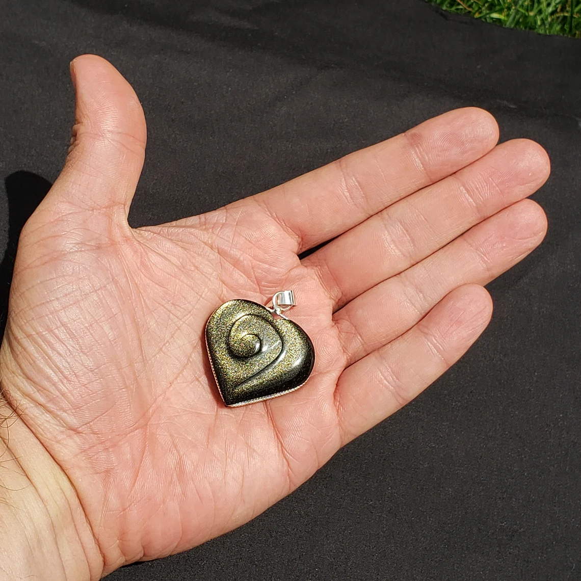 This is a chatoyant Gold Sheen Obsidian Heart Pendant from Mexico. This is a wonderful tool for use in protection, grounding, meditation, and its surface mixture of black and gold make it great for scrying. This heart-shape can help protect one from negative energies, discover previously unknown paths to healing, and for clearing blockages, especially in the sacral chakra. It’s a great size to take with you on your travels, or you can keep in your healing space or as a generator in a grid.