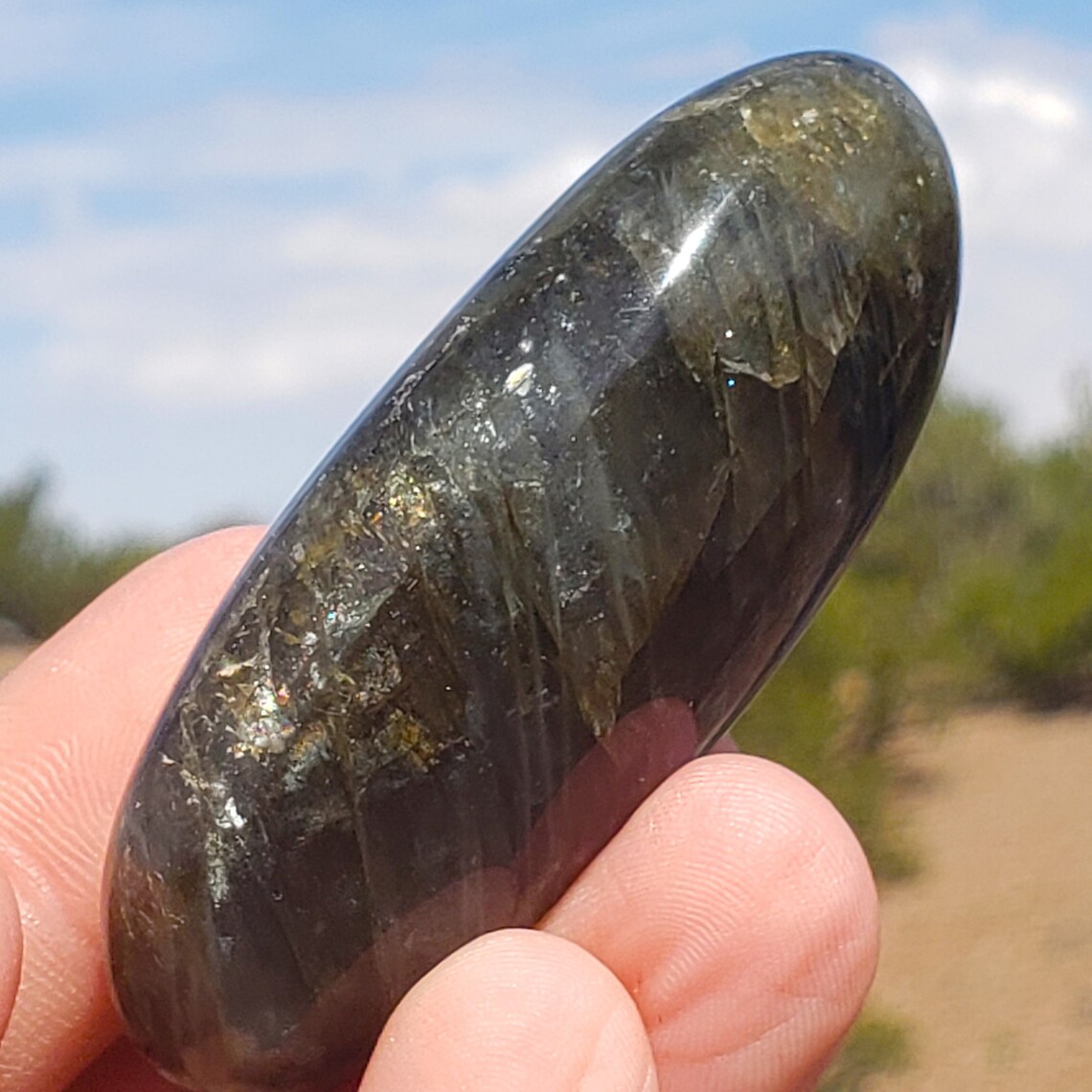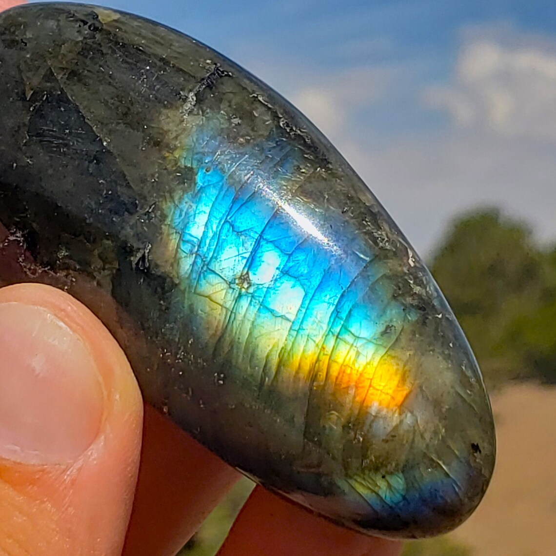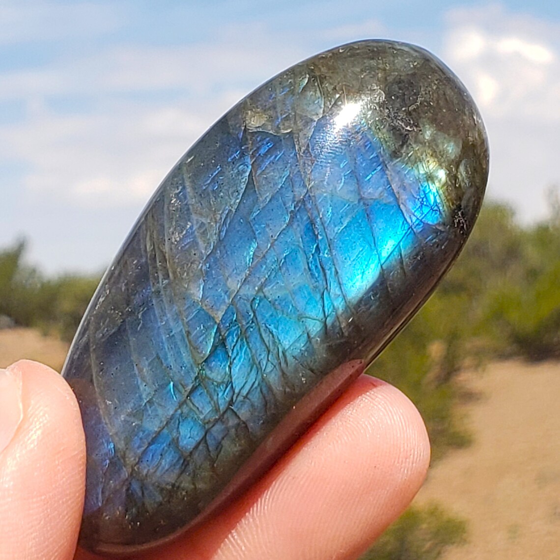 This is a high quality, polished Labradorite palmstone from Madagascar with high chatoyancy and many different flashy colors.
