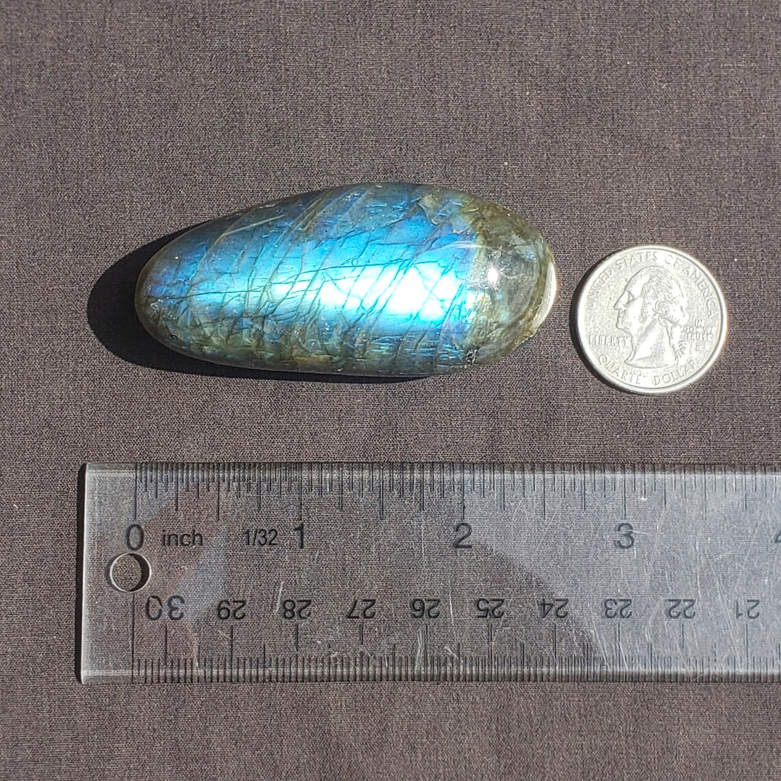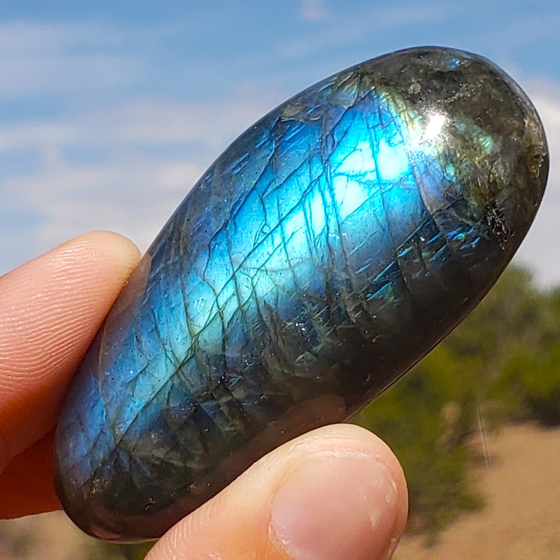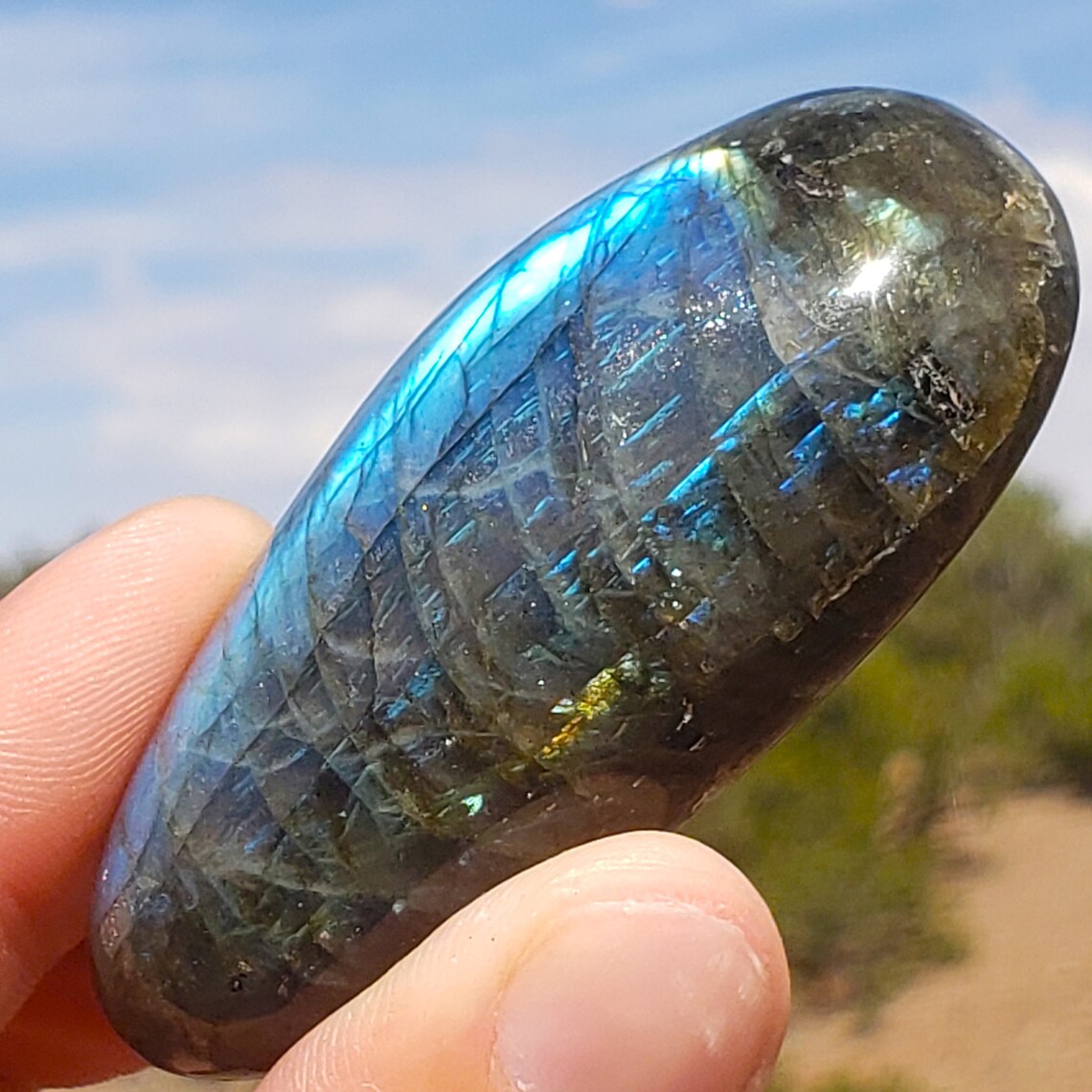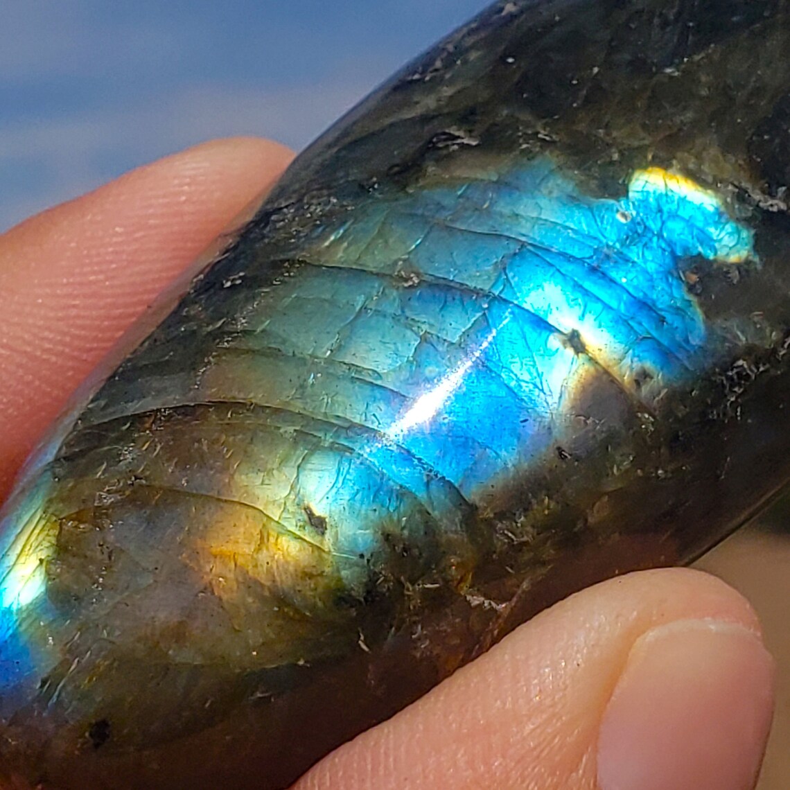 This is a high quality, polished Labradorite palmstone from Madagascar with high chatoyancy and many different flashy colors.