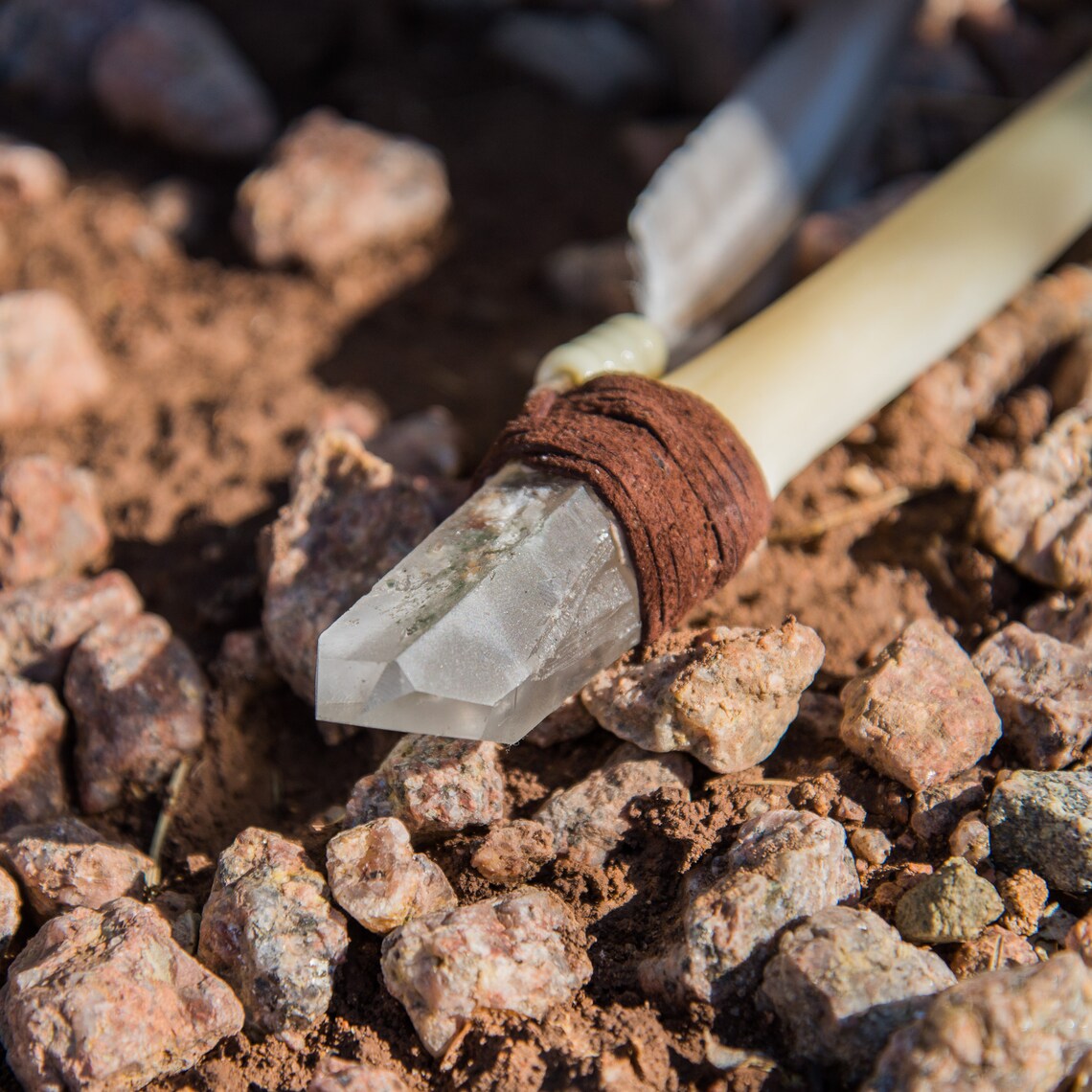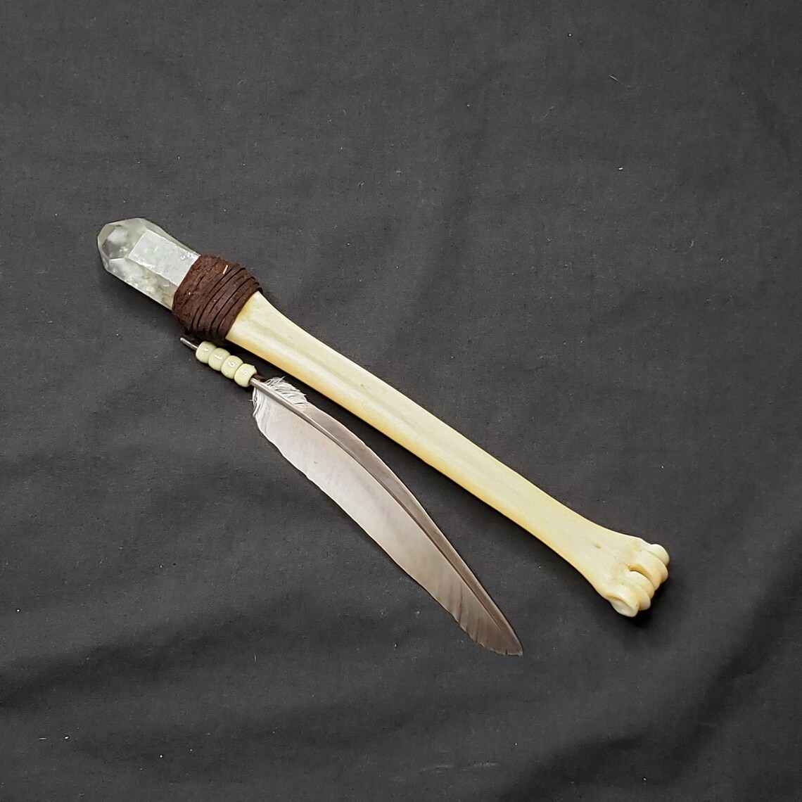 This is a Magic Crystal Wand fashioned by me! It measures 10 inches in length and is comprised of a leg bone from an antelope, a Chlorite included point from Brazil, and a Grackle feather collected ethically here in Arizona.